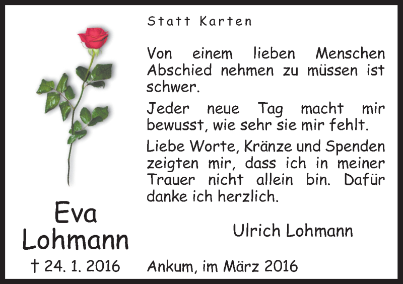 Hier finden Sie alle Traueranzeigen aus der Zeitung, die bisher für Eva Lohmann erschienen sind. Weitere Traueranzeigen, die in der Zeitung erscheinen, werden hier ebenfalls aufgelistet