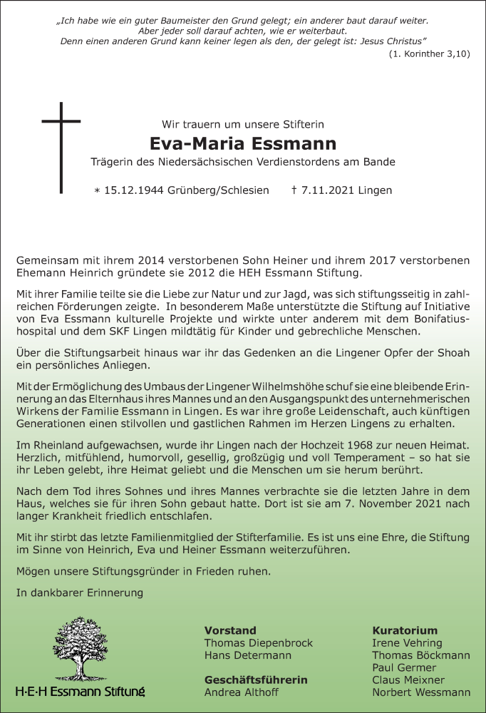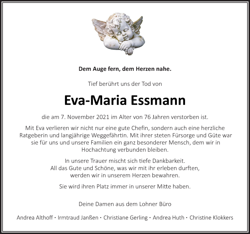 Hier finden Sie alle Traueranzeigen aus der Zeitung, die bisher für Eva-Maria Essmann erschienen sind. Weitere Traueranzeigen, die in der Zeitung erscheinen, werden hier ebenfalls aufgelistet