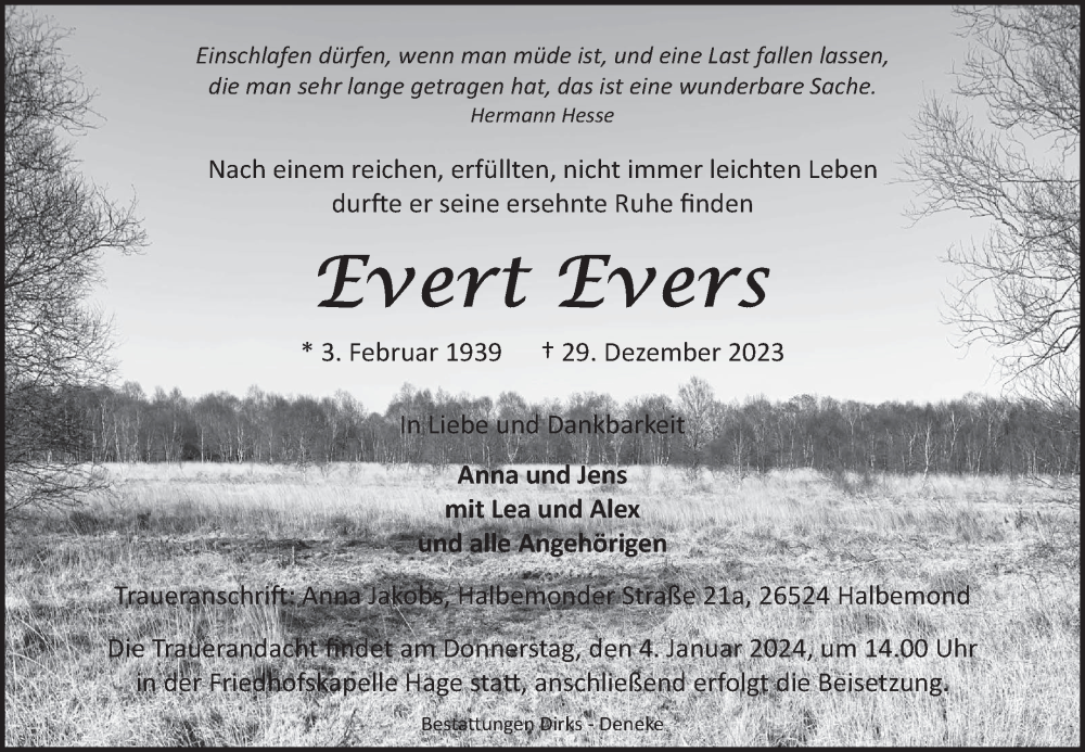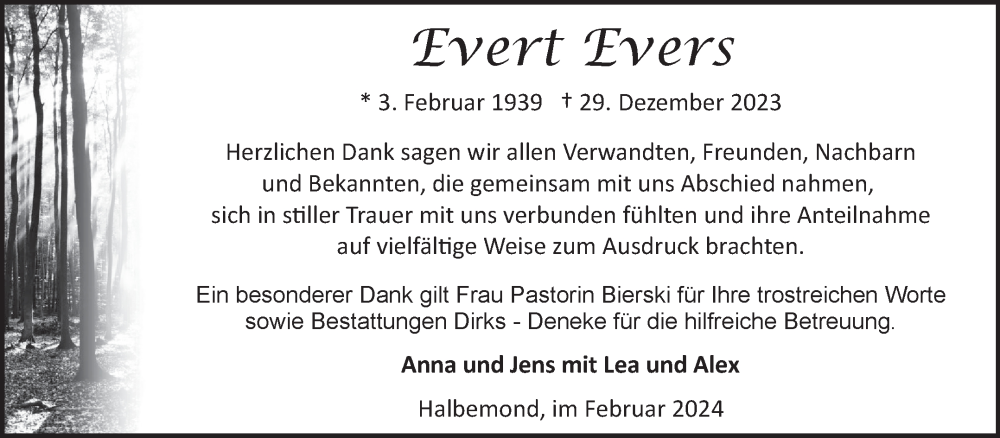 Hier finden Sie alle Traueranzeigen aus der Zeitung, die bisher für Evert Evers erschienen sind. Weitere Traueranzeigen, die in der Zeitung erscheinen, werden hier ebenfalls aufgelistet