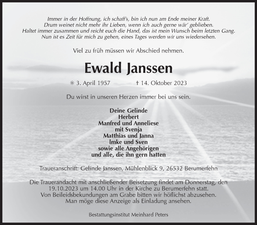 Hier finden Sie alle Traueranzeigen aus der Zeitung, die bisher für Ewald Janssen erschienen sind. Weitere Traueranzeigen, die in der Zeitung erscheinen, werden hier ebenfalls aufgelistet