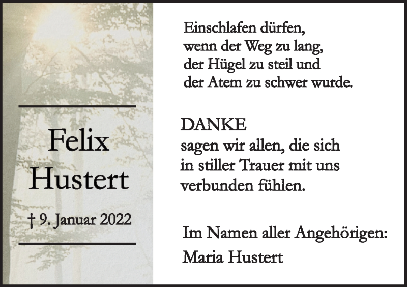 Hier finden Sie alle Traueranzeigen aus der Zeitung, die bisher für Felix Hustert erschienen sind. Weitere Traueranzeigen, die in der Zeitung erscheinen, werden hier ebenfalls aufgelistet
