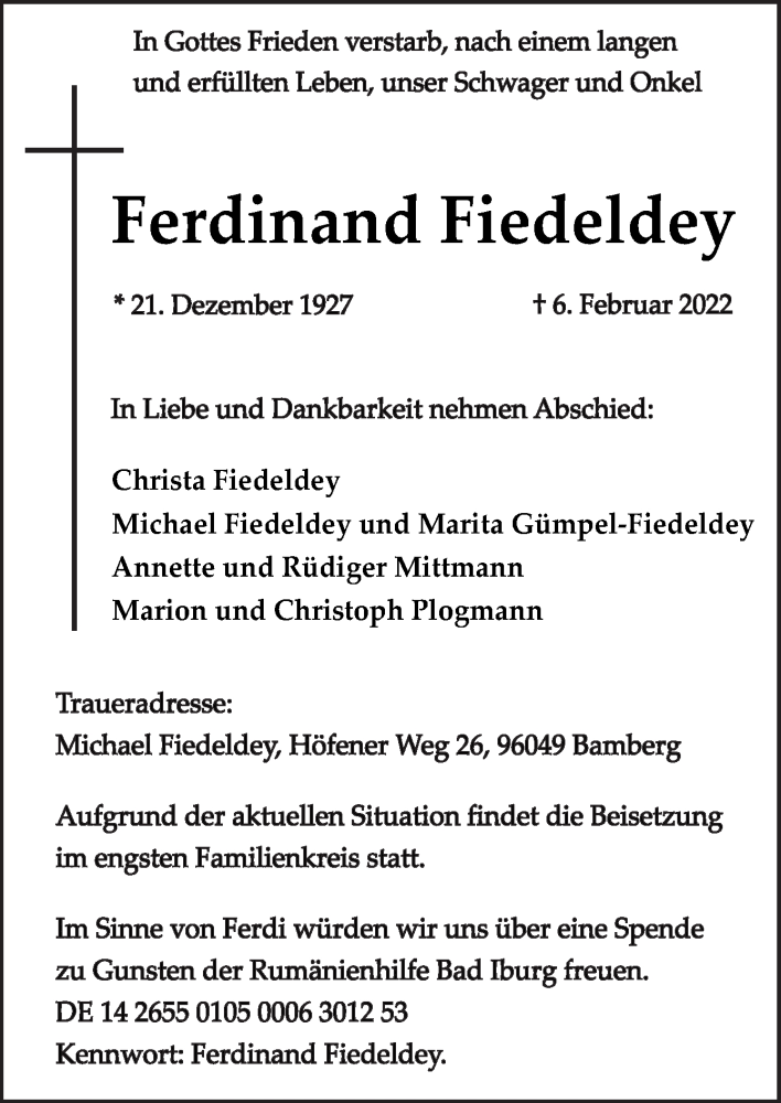 Hier finden Sie alle Traueranzeigen aus der Zeitung, die bisher für Ferdinand Fiedeldey erschienen sind. Weitere Traueranzeigen, die in der Zeitung erscheinen, werden hier ebenfalls aufgelistet