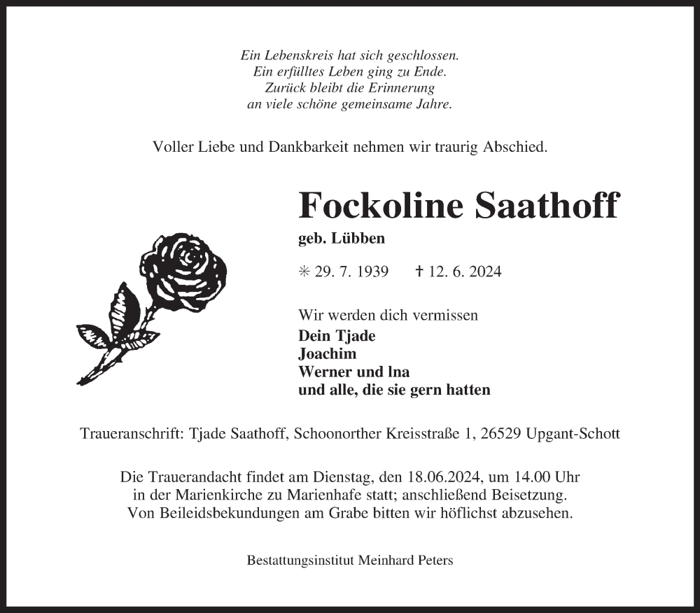 Hier finden Sie alle Traueranzeigen aus der Zeitung, die bisher für Fockoline Saathoff erschienen sind. Weitere Traueranzeigen, die in der Zeitung erscheinen, werden hier ebenfalls aufgelistet