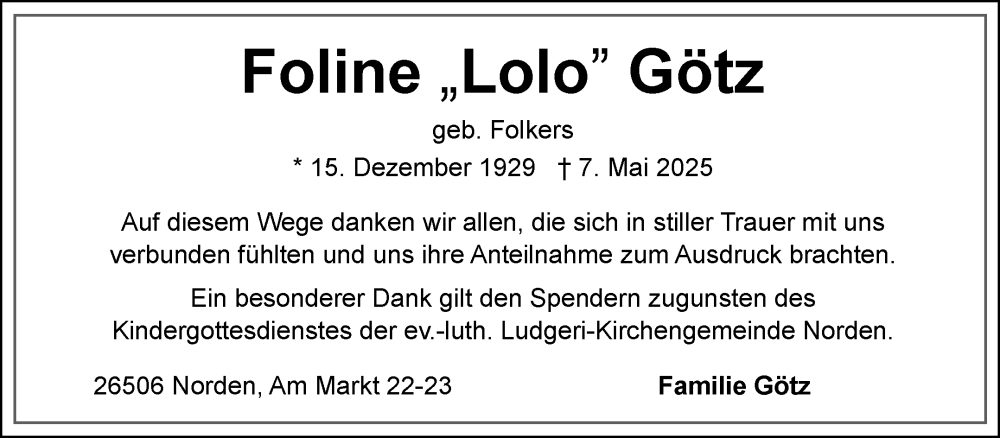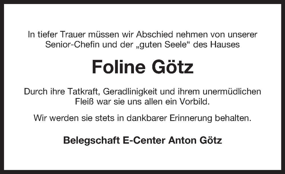 Hier finden Sie alle Traueranzeigen aus der Zeitung, die bisher für Foline Götz erschienen sind. Weitere Traueranzeigen, die in der Zeitung erscheinen, werden hier ebenfalls aufgelistet