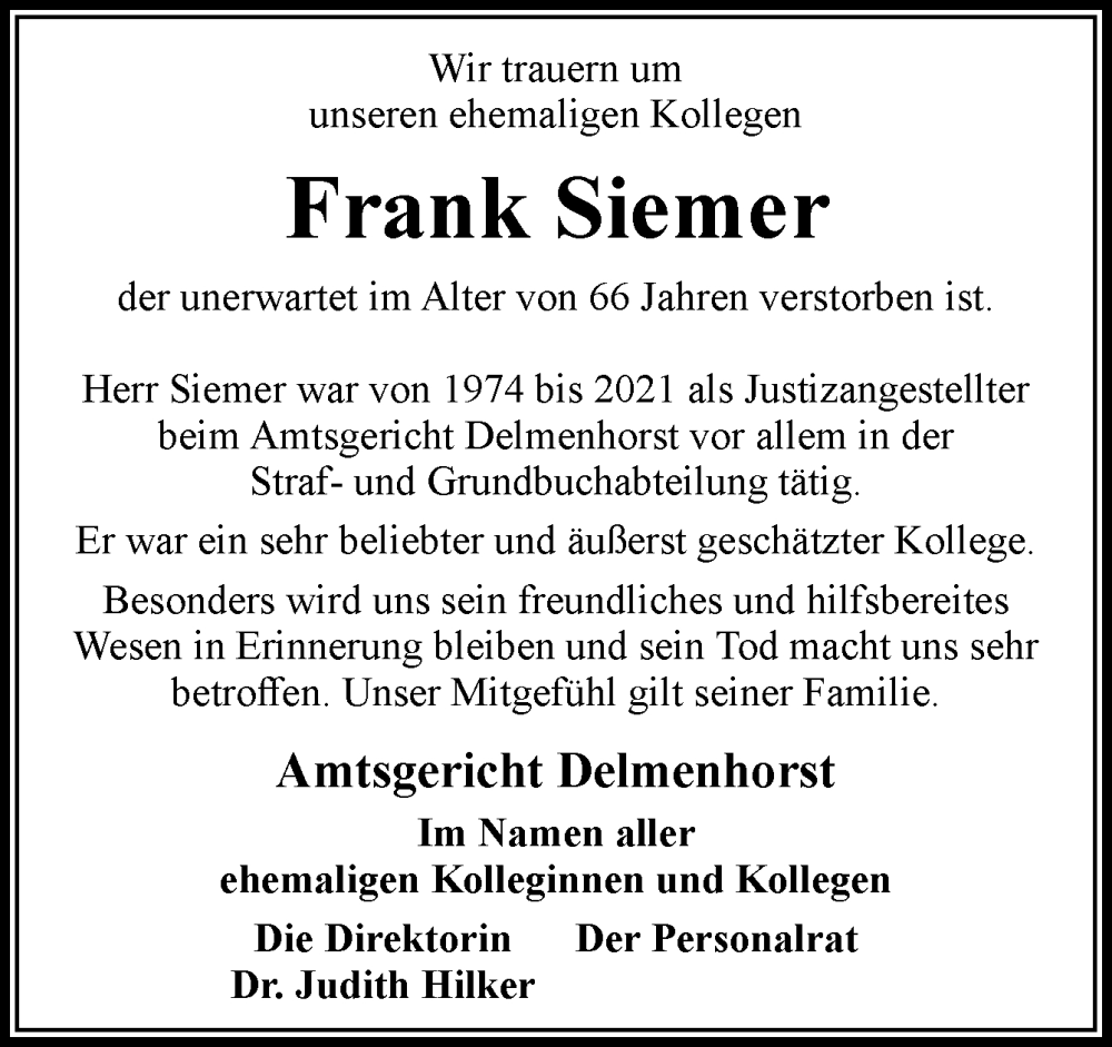 Hier finden Sie alle Traueranzeigen aus der Zeitung, die bisher für Frank Siemer erschienen sind. Weitere Traueranzeigen, die in der Zeitung erscheinen, werden hier ebenfalls aufgelistet
