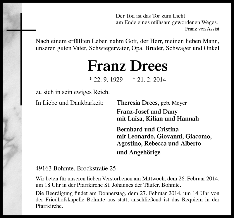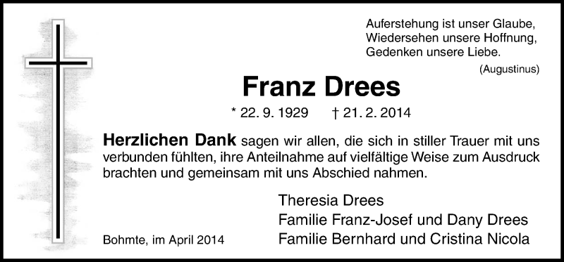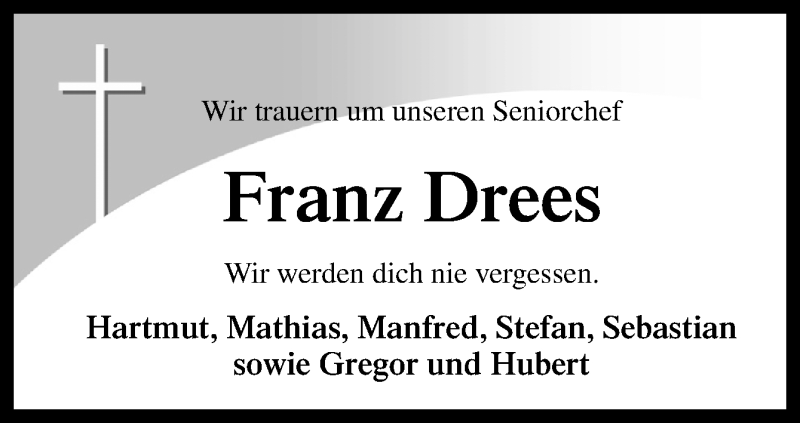 Hier finden Sie alle Traueranzeigen aus der Zeitung, die bisher für Franz Drees erschienen sind. Weitere Traueranzeigen, die in der Zeitung erscheinen, werden hier ebenfalls aufgelistet