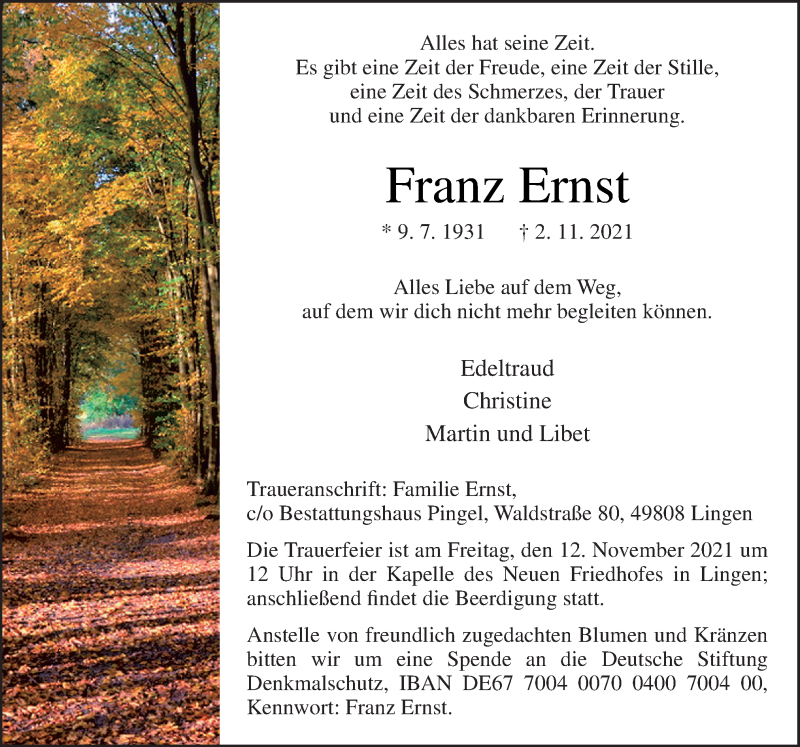 Hier finden Sie alle Traueranzeigen aus der Zeitung, die bisher für Franz Ernst erschienen sind. Weitere Traueranzeigen, die in der Zeitung erscheinen, werden hier ebenfalls aufgelistet