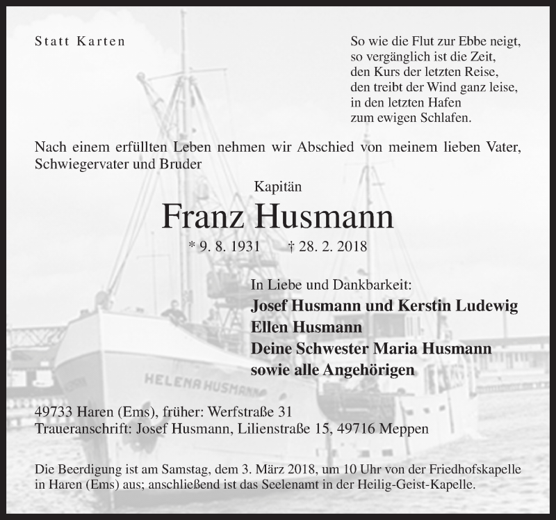 Hier finden Sie alle Traueranzeigen aus der Zeitung, die bisher für Franz Husmann erschienen sind. Weitere Traueranzeigen, die in der Zeitung erscheinen, werden hier ebenfalls aufgelistet