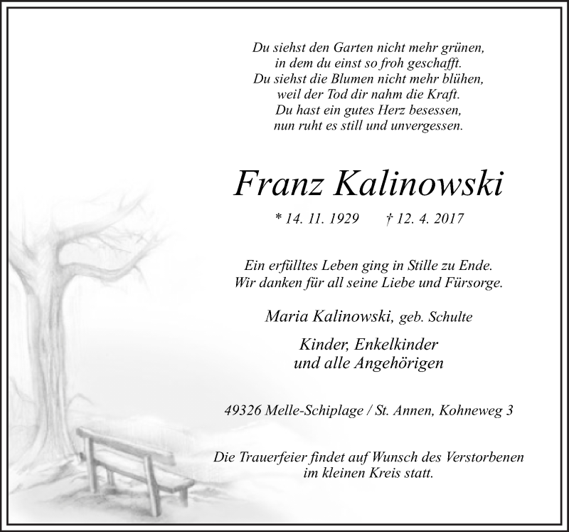 Hier finden Sie alle Traueranzeigen aus der Zeitung, die bisher für Franz Kalinowski erschienen sind. Weitere Traueranzeigen, die in der Zeitung erscheinen, werden hier ebenfalls aufgelistet