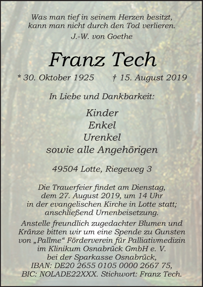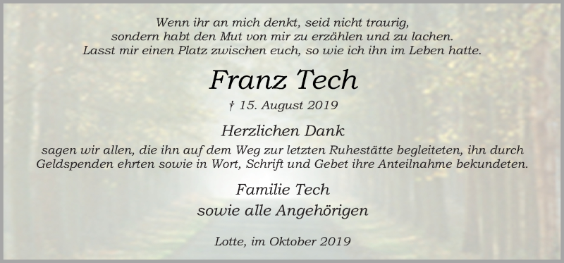 Hier finden Sie alle Traueranzeigen aus der Zeitung, die bisher für Franz Tech erschienen sind. Weitere Traueranzeigen, die in der Zeitung erscheinen, werden hier ebenfalls aufgelistet