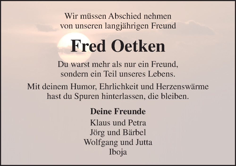 Hier finden Sie alle Traueranzeigen aus der Zeitung, die bisher für Fred Oetken erschienen sind. Weitere Traueranzeigen, die in der Zeitung erscheinen, werden hier ebenfalls aufgelistet
