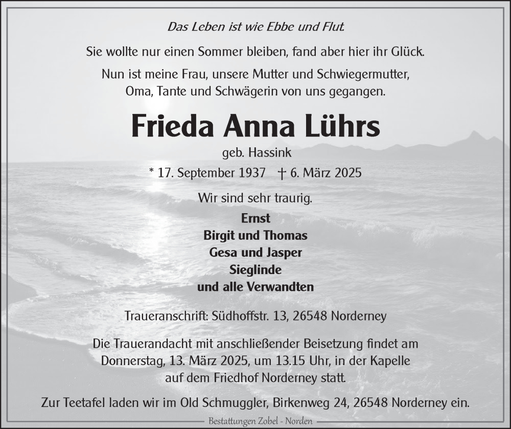 Hier finden Sie alle Traueranzeigen aus der Zeitung, die bisher für Frieda Anna Lührs erschienen sind. Weitere Traueranzeigen, die in der Zeitung erscheinen, werden hier ebenfalls aufgelistet