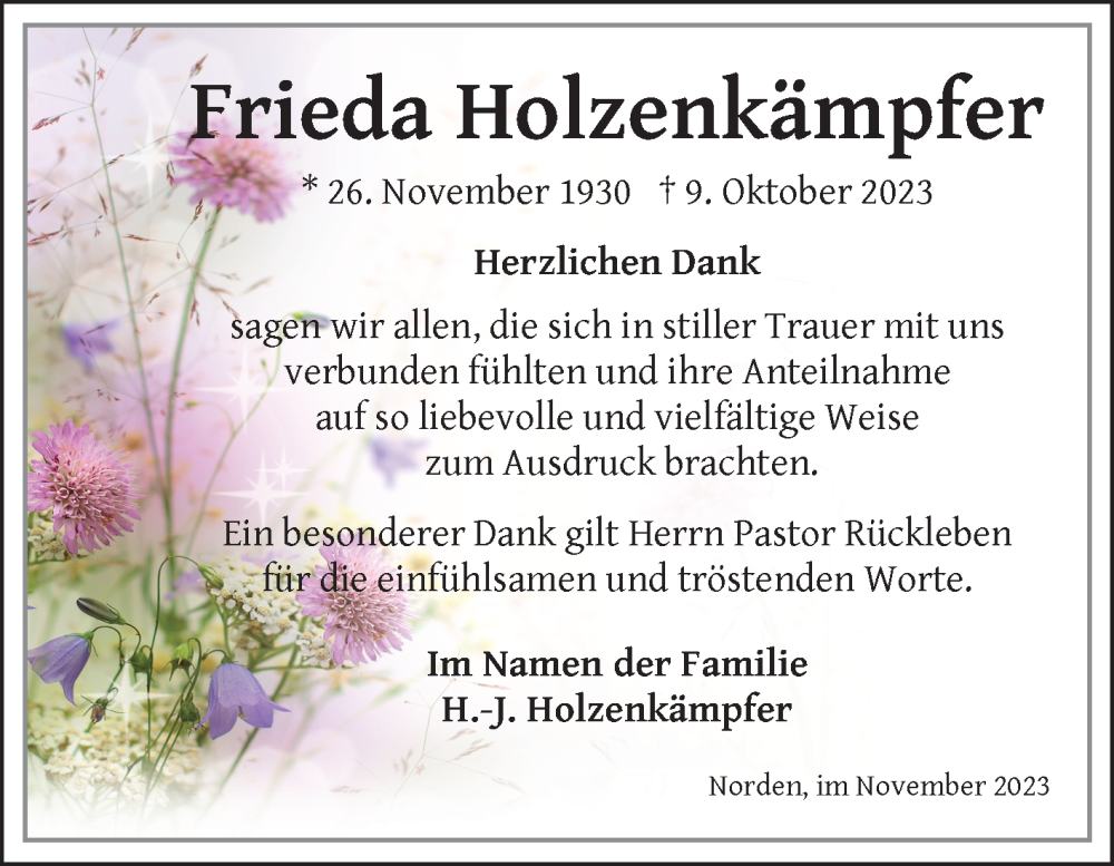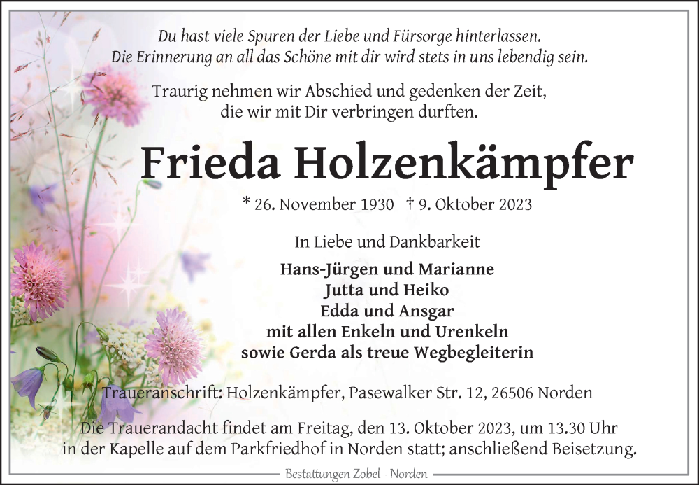Hier finden Sie alle Traueranzeigen aus der Zeitung, die bisher für Frieda Holzenkämpfer erschienen sind. Weitere Traueranzeigen, die in der Zeitung erscheinen, werden hier ebenfalls aufgelistet