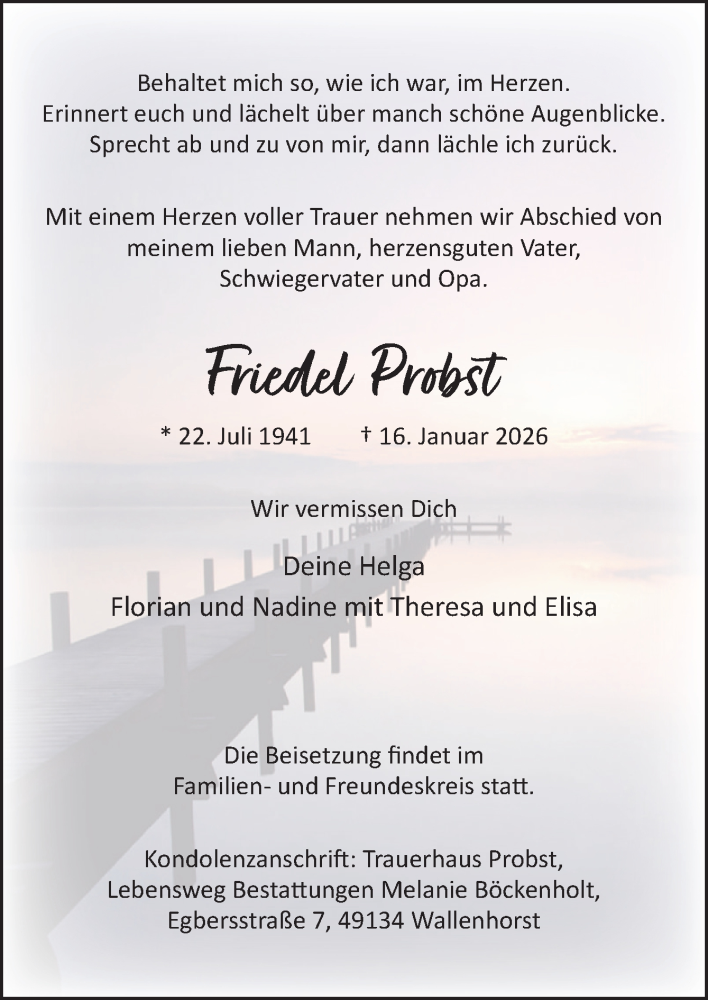 Hier finden Sie alle Traueranzeigen aus der Zeitung, die bisher für Friedel Probst erschienen sind. Weitere Traueranzeigen, die in der Zeitung erscheinen, werden hier ebenfalls aufgelistet