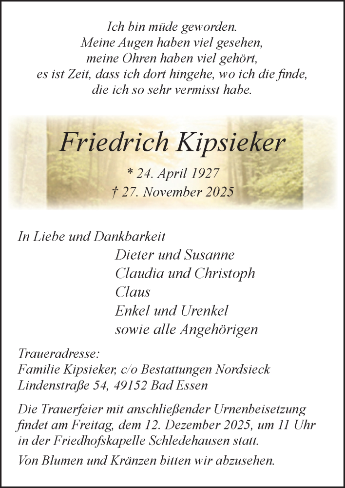 Hier finden Sie alle Traueranzeigen aus der Zeitung, die bisher für Friedrich Kipsieker erschienen sind. Weitere Traueranzeigen, die in der Zeitung erscheinen, werden hier ebenfalls aufgelistet