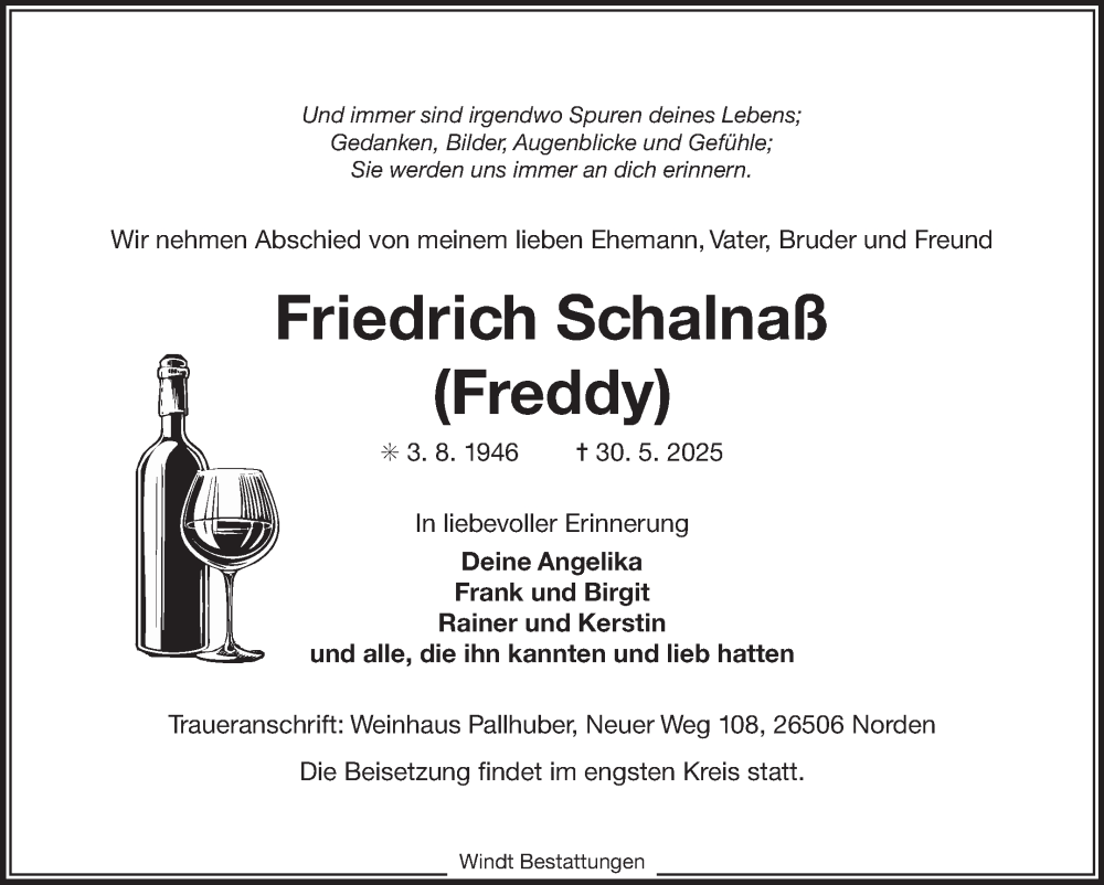 Hier finden Sie alle Traueranzeigen aus der Zeitung, die bisher für Friedrich Schalnaß erschienen sind. Weitere Traueranzeigen, die in der Zeitung erscheinen, werden hier ebenfalls aufgelistet
