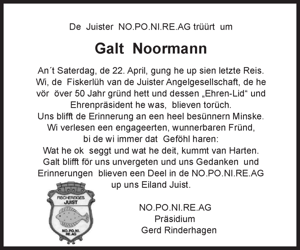 Hier finden Sie alle Traueranzeigen aus der Zeitung, die bisher für Galt Noormann erschienen sind. Weitere Traueranzeigen, die in der Zeitung erscheinen, werden hier ebenfalls aufgelistet