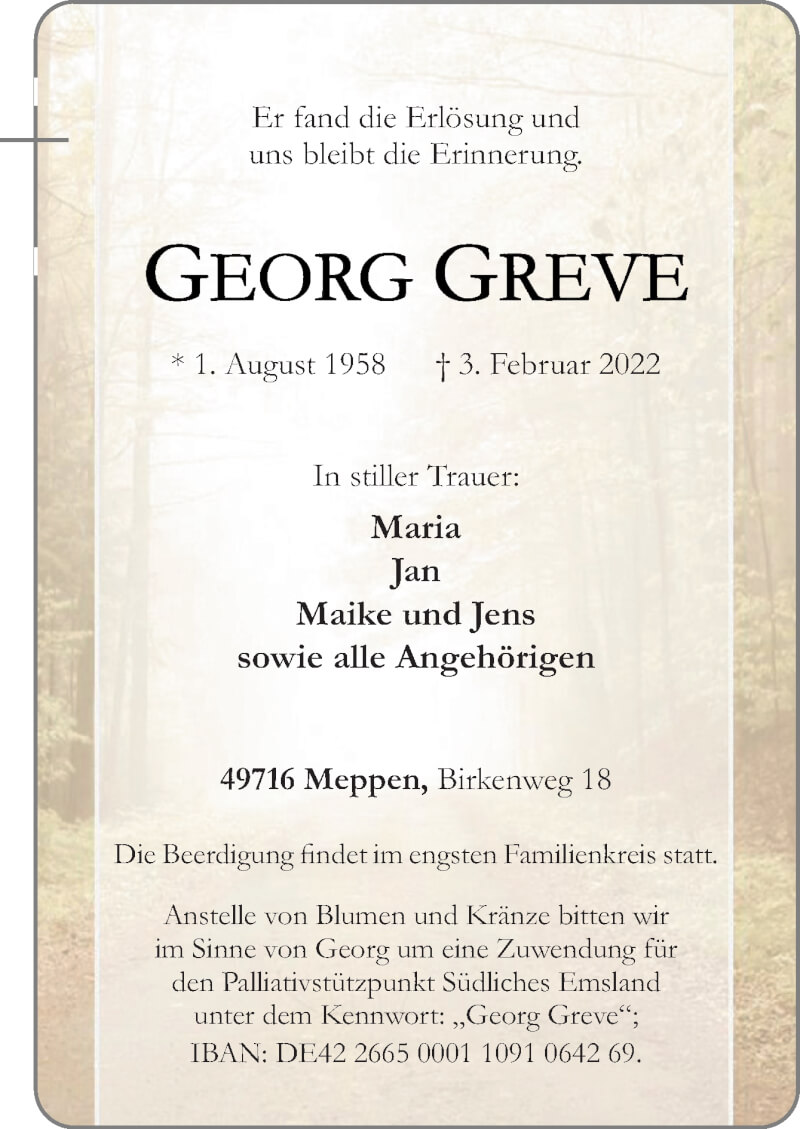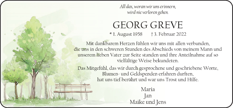 Hier finden Sie alle Traueranzeigen aus der Zeitung, die bisher für Georg Greve erschienen sind. Weitere Traueranzeigen, die in der Zeitung erscheinen, werden hier ebenfalls aufgelistet