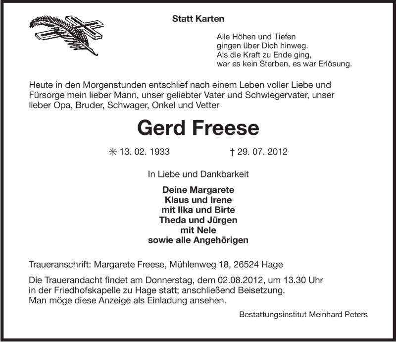 Hier finden Sie alle Traueranzeigen aus der Zeitung, die bisher für Gerd Freese erschienen sind. Weitere Traueranzeigen, die in der Zeitung erscheinen, werden hier ebenfalls aufgelistet