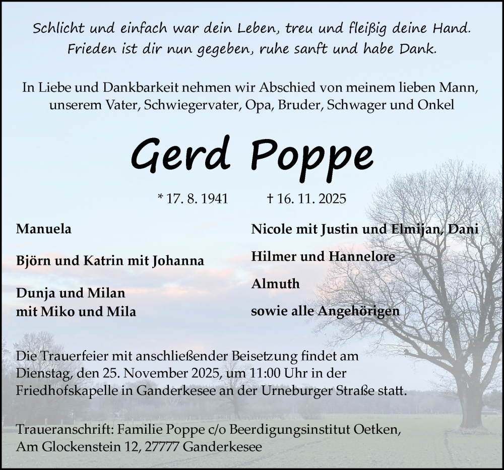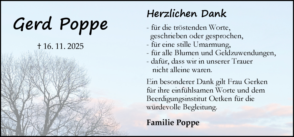 Hier finden Sie alle Traueranzeigen aus der Zeitung, die bisher für Gerd Poppe erschienen sind. Weitere Traueranzeigen, die in der Zeitung erscheinen, werden hier ebenfalls aufgelistet