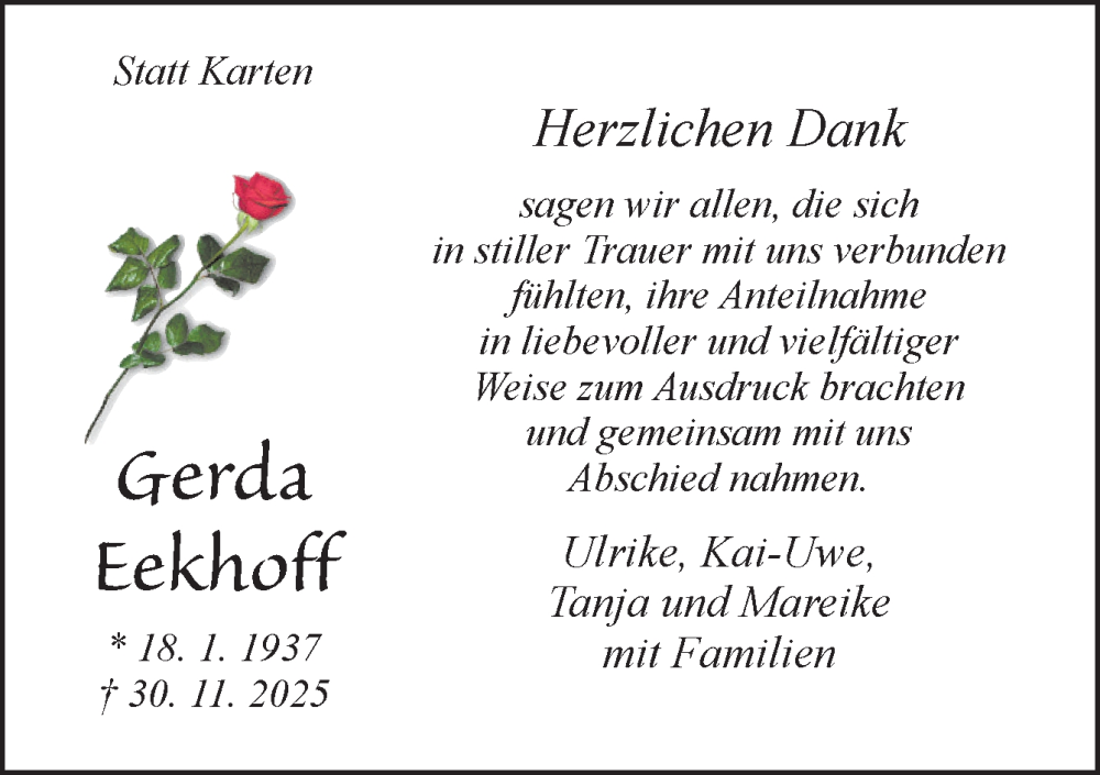 Hier finden Sie alle Traueranzeigen aus der Zeitung, die bisher für Gerda Eekhoff erschienen sind. Weitere Traueranzeigen, die in der Zeitung erscheinen, werden hier ebenfalls aufgelistet