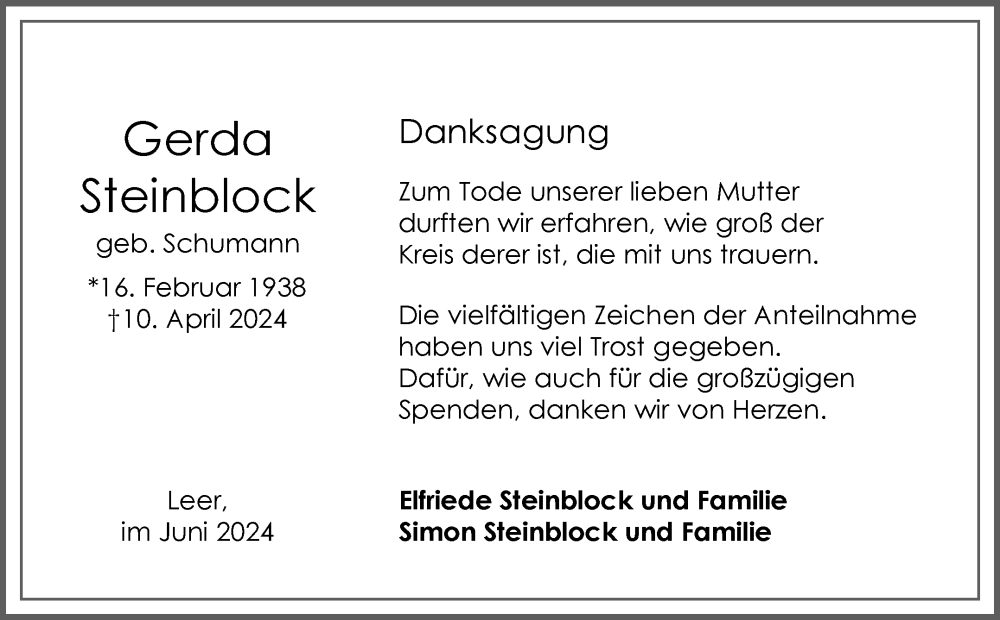 Hier finden Sie alle Traueranzeigen aus der Zeitung, die bisher für Gerda Steinblock erschienen sind. Weitere Traueranzeigen, die in der Zeitung erscheinen, werden hier ebenfalls aufgelistet
