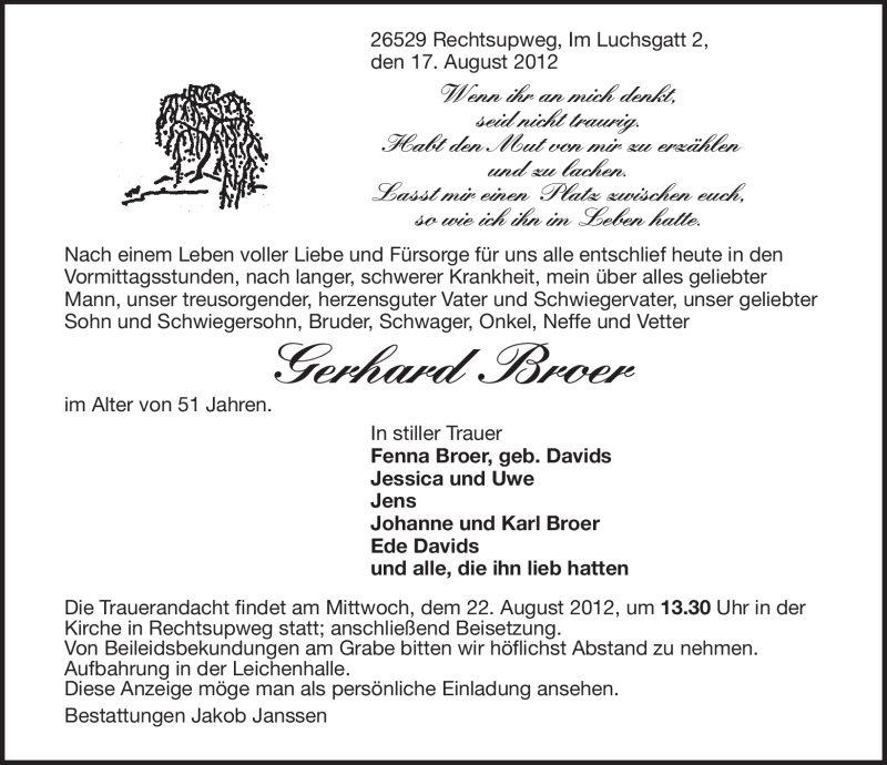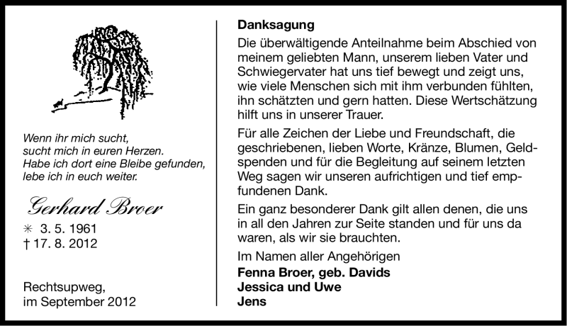 Hier finden Sie alle Traueranzeigen aus der Zeitung, die bisher für Gerhard Broer erschienen sind. Weitere Traueranzeigen, die in der Zeitung erscheinen, werden hier ebenfalls aufgelistet