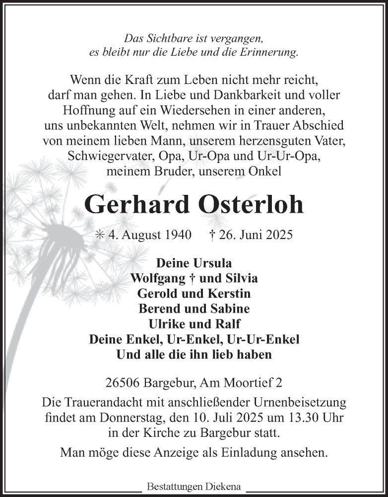 Hier finden Sie alle Traueranzeigen aus der Zeitung, die bisher für Gerhard Osterloh erschienen sind. Weitere Traueranzeigen, die in der Zeitung erscheinen, werden hier ebenfalls aufgelistet