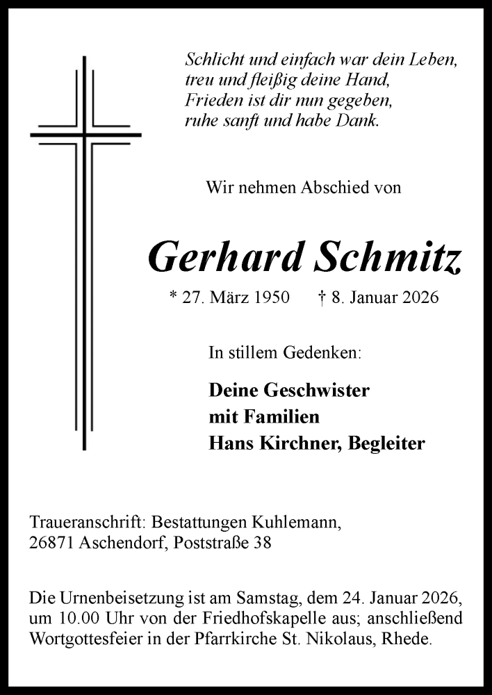 Hier finden Sie alle Traueranzeigen aus der Zeitung, die bisher für Gerhard Schmitz erschienen sind. Weitere Traueranzeigen, die in der Zeitung erscheinen, werden hier ebenfalls aufgelistet