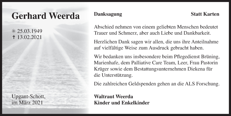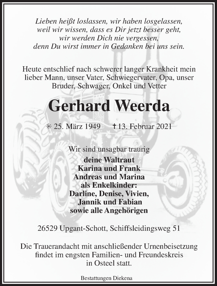 Hier finden Sie alle Traueranzeigen aus der Zeitung, die bisher für Gerhard Weerda erschienen sind. Weitere Traueranzeigen, die in der Zeitung erscheinen, werden hier ebenfalls aufgelistet