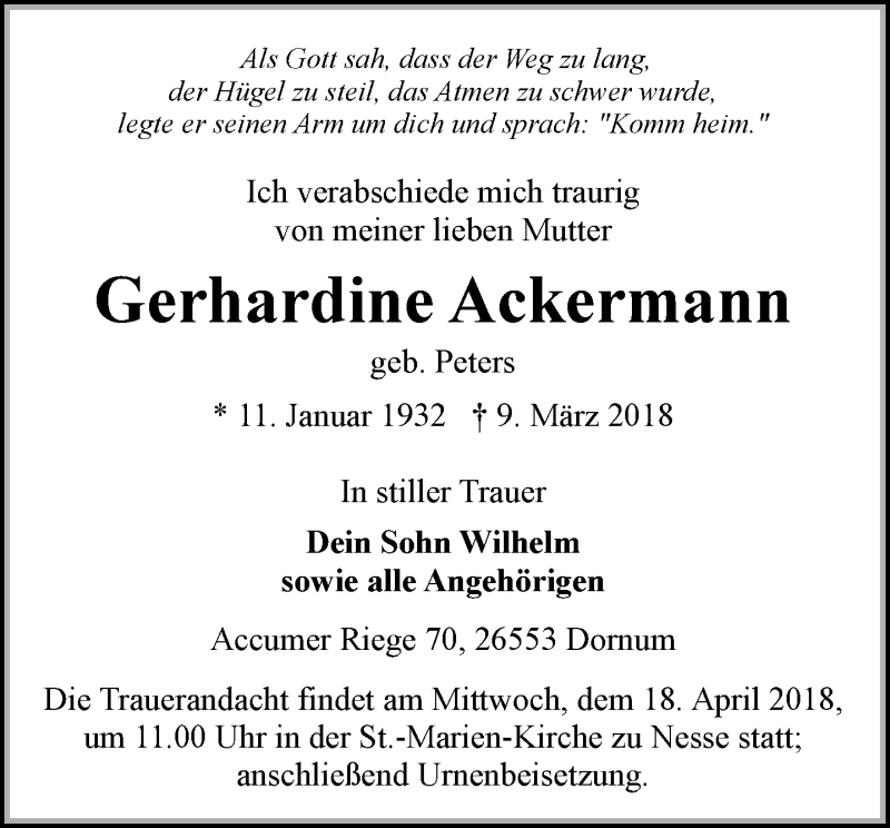 Hier finden Sie alle Traueranzeigen aus der Zeitung, die bisher für Gerhardine Ackermann erschienen sind. Weitere Traueranzeigen, die in der Zeitung erscheinen, werden hier ebenfalls aufgelistet