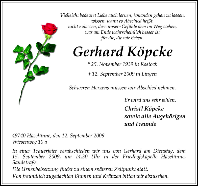 Hier finden Sie alle Traueranzeigen aus der Zeitung, die bisher für Gerhard Köpcke erschienen sind. Weitere Traueranzeigen, die in der Zeitung erscheinen, werden hier ebenfalls aufgelistet