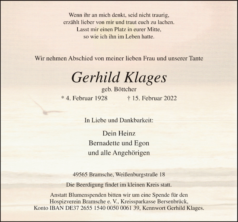Hier finden Sie alle Traueranzeigen aus der Zeitung, die bisher für Gerhild Klages erschienen sind. Weitere Traueranzeigen, die in der Zeitung erscheinen, werden hier ebenfalls aufgelistet