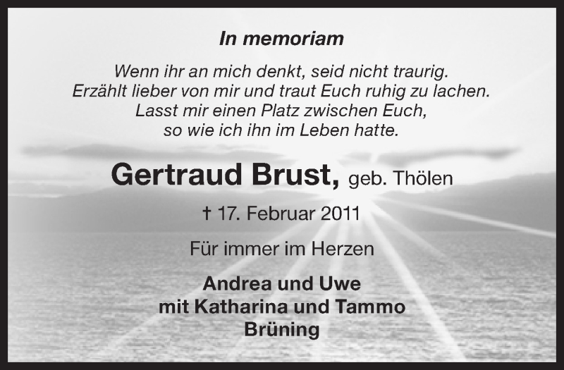 Hier finden Sie alle Traueranzeigen aus der Zeitung, die bisher für Gertraud Brust erschienen sind. Weitere Traueranzeigen, die in der Zeitung erscheinen, werden hier ebenfalls aufgelistet