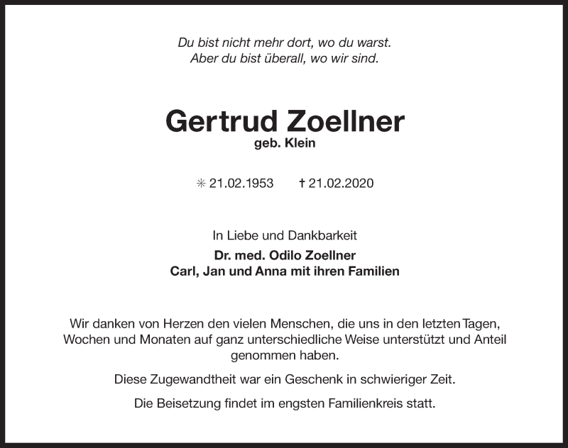 Hier finden Sie alle Traueranzeigen aus der Zeitung, die bisher für Gertrud Zoellner erschienen sind. Weitere Traueranzeigen, die in der Zeitung erscheinen, werden hier ebenfalls aufgelistet