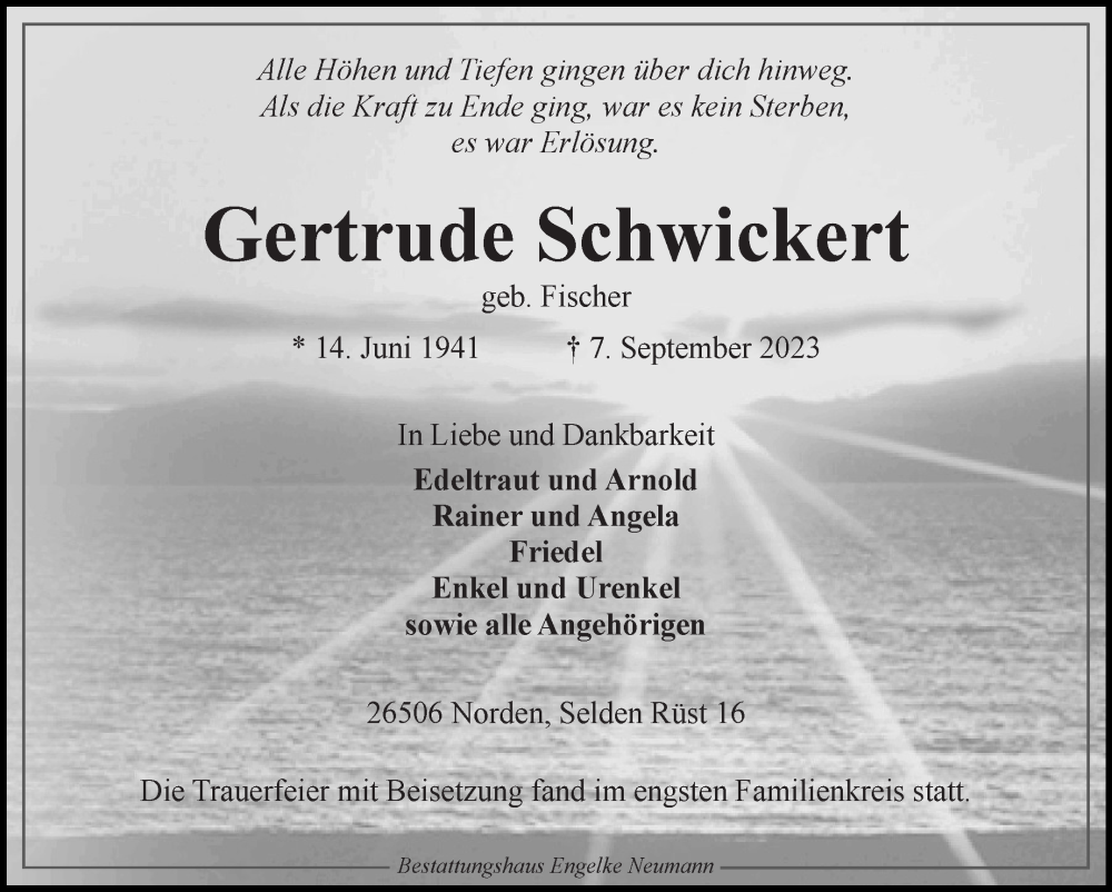 Hier finden Sie alle Traueranzeigen aus der Zeitung, die bisher für Gertrude Schwickert erschienen sind. Weitere Traueranzeigen, die in der Zeitung erscheinen, werden hier ebenfalls aufgelistet