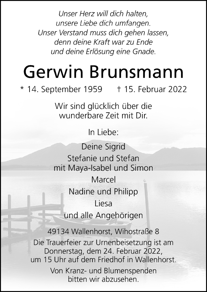 Hier finden Sie alle Traueranzeigen aus der Zeitung, die bisher für Gerwin Brunsmann erschienen sind. Weitere Traueranzeigen, die in der Zeitung erscheinen, werden hier ebenfalls aufgelistet
