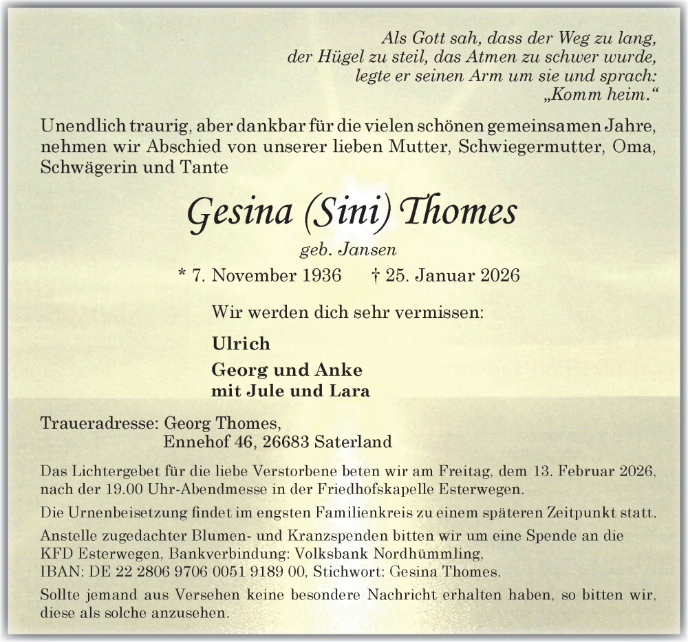 Hier finden Sie alle Traueranzeigen aus der Zeitung, die bisher für Gesina Thomes erschienen sind. Weitere Traueranzeigen, die in der Zeitung erscheinen, werden hier ebenfalls aufgelistet