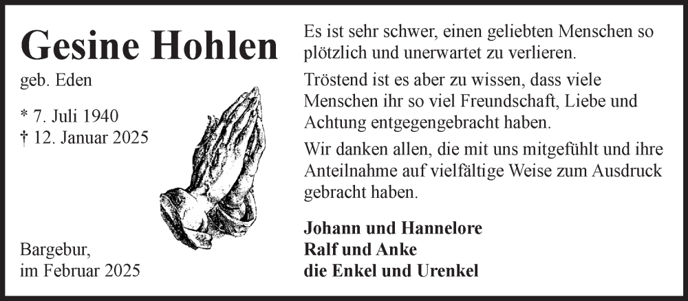 Hier finden Sie alle Traueranzeigen aus der Zeitung, die bisher für Gesine Hohlen erschienen sind. Weitere Traueranzeigen, die in der Zeitung erscheinen, werden hier ebenfalls aufgelistet
