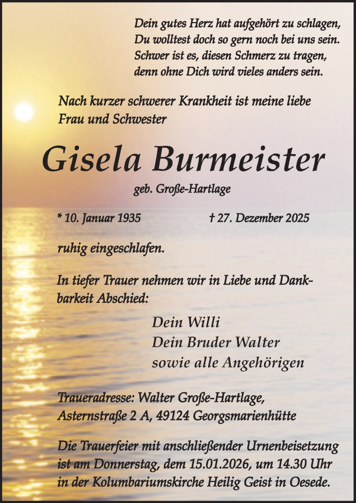 Hier finden Sie alle Traueranzeigen aus der Zeitung, die bisher für Gisela Burmeister erschienen sind. Weitere Traueranzeigen, die in der Zeitung erscheinen, werden hier ebenfalls aufgelistet