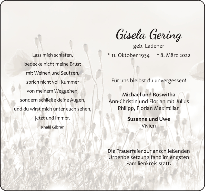 Hier finden Sie alle Traueranzeigen aus der Zeitung, die bisher für Gisela Gering erschienen sind. Weitere Traueranzeigen, die in der Zeitung erscheinen, werden hier ebenfalls aufgelistet