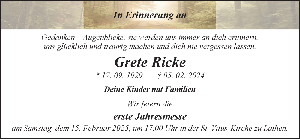 Hier finden Sie alle Traueranzeigen aus der Zeitung, die bisher für Grete Ricke erschienen sind. Weitere Traueranzeigen, die in der Zeitung erscheinen, werden hier ebenfalls aufgelistet