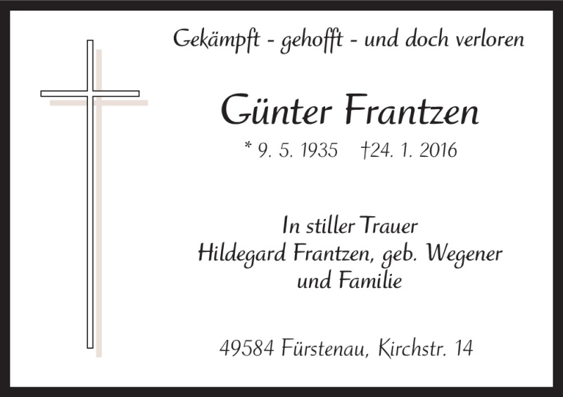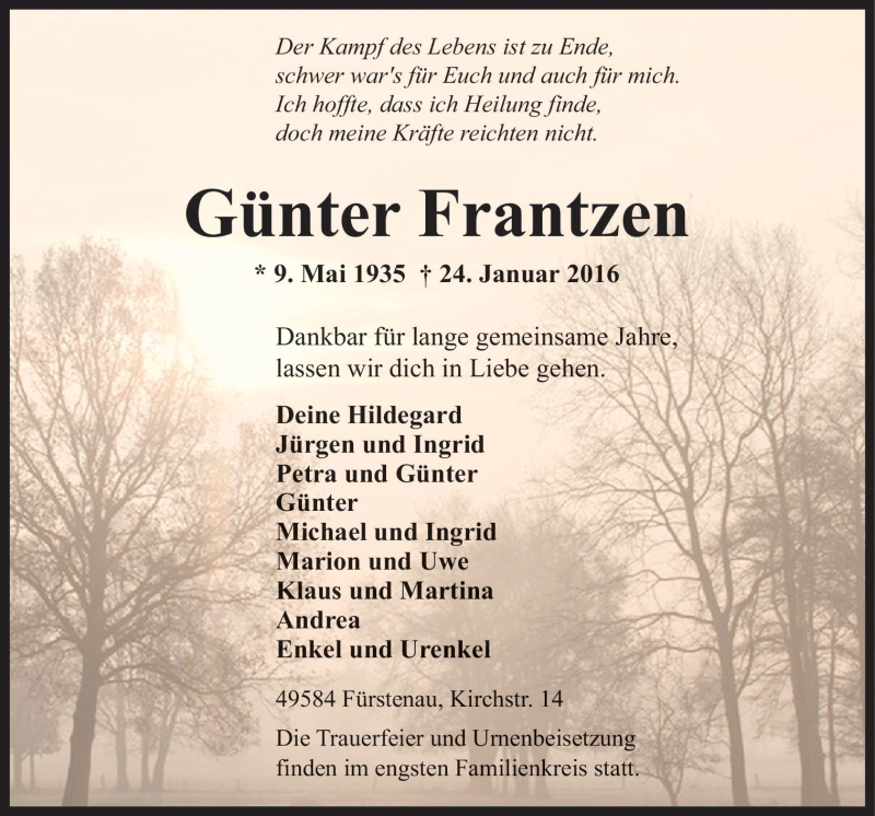 Hier finden Sie alle Traueranzeigen aus der Zeitung, die bisher für Günter Frantzen erschienen sind. Weitere Traueranzeigen, die in der Zeitung erscheinen, werden hier ebenfalls aufgelistet