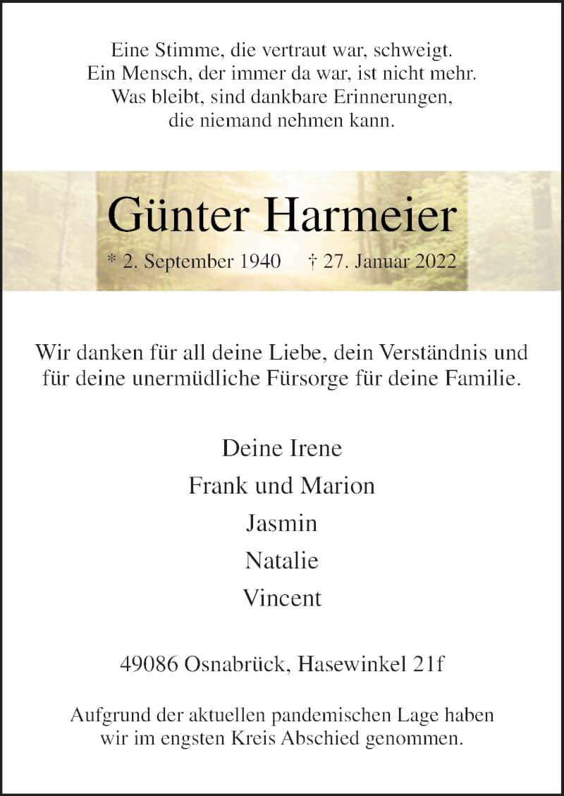 Hier finden Sie alle Traueranzeigen aus der Zeitung, die bisher für Günter Harmeier erschienen sind. Weitere Traueranzeigen, die in der Zeitung erscheinen, werden hier ebenfalls aufgelistet