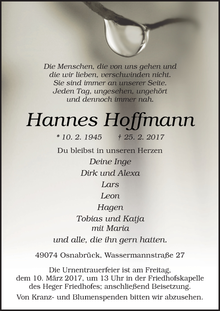 Hier finden Sie alle Traueranzeigen aus der Zeitung, die bisher für Hannes Hoffmann erschienen sind. Weitere Traueranzeigen, die in der Zeitung erscheinen, werden hier ebenfalls aufgelistet