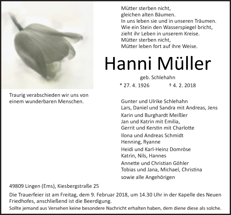 Hier finden Sie alle Traueranzeigen aus der Zeitung, die bisher für Hanni Müller erschienen sind. Weitere Traueranzeigen, die in der Zeitung erscheinen, werden hier ebenfalls aufgelistet