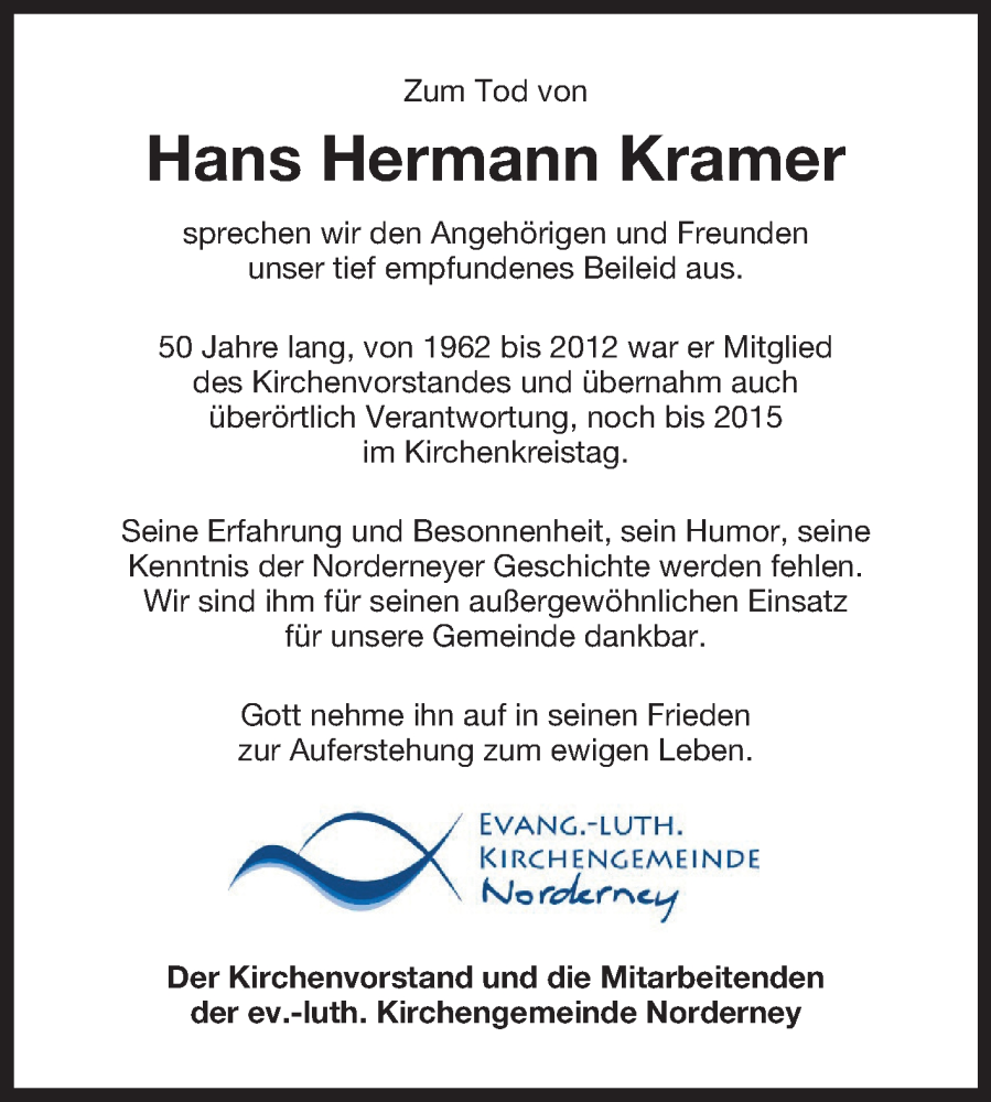 Hier finden Sie alle Traueranzeigen aus der Zeitung, die bisher für Hans Hermann Kramer erschienen sind. Weitere Traueranzeigen, die in der Zeitung erscheinen, werden hier ebenfalls aufgelistet