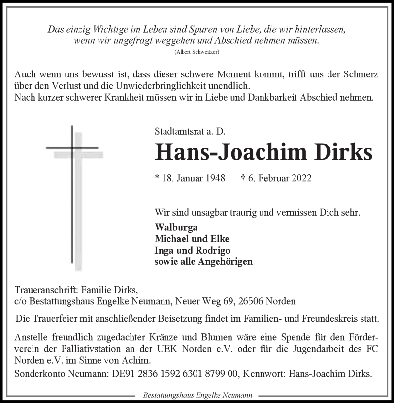 Hier finden Sie alle Traueranzeigen aus der Zeitung, die bisher für Hans-Joachim Dirks erschienen sind. Weitere Traueranzeigen, die in der Zeitung erscheinen, werden hier ebenfalls aufgelistet