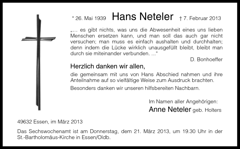 Hier finden Sie alle Traueranzeigen aus der Zeitung, die bisher für Hans Neteler erschienen sind. Weitere Traueranzeigen, die in der Zeitung erscheinen, werden hier ebenfalls aufgelistet