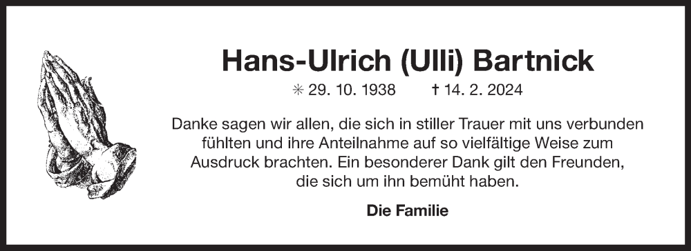 Hier finden Sie alle Traueranzeigen aus der Zeitung, die bisher für Hans-Ulrich Bartnick erschienen sind. Weitere Traueranzeigen, die in der Zeitung erscheinen, werden hier ebenfalls aufgelistet